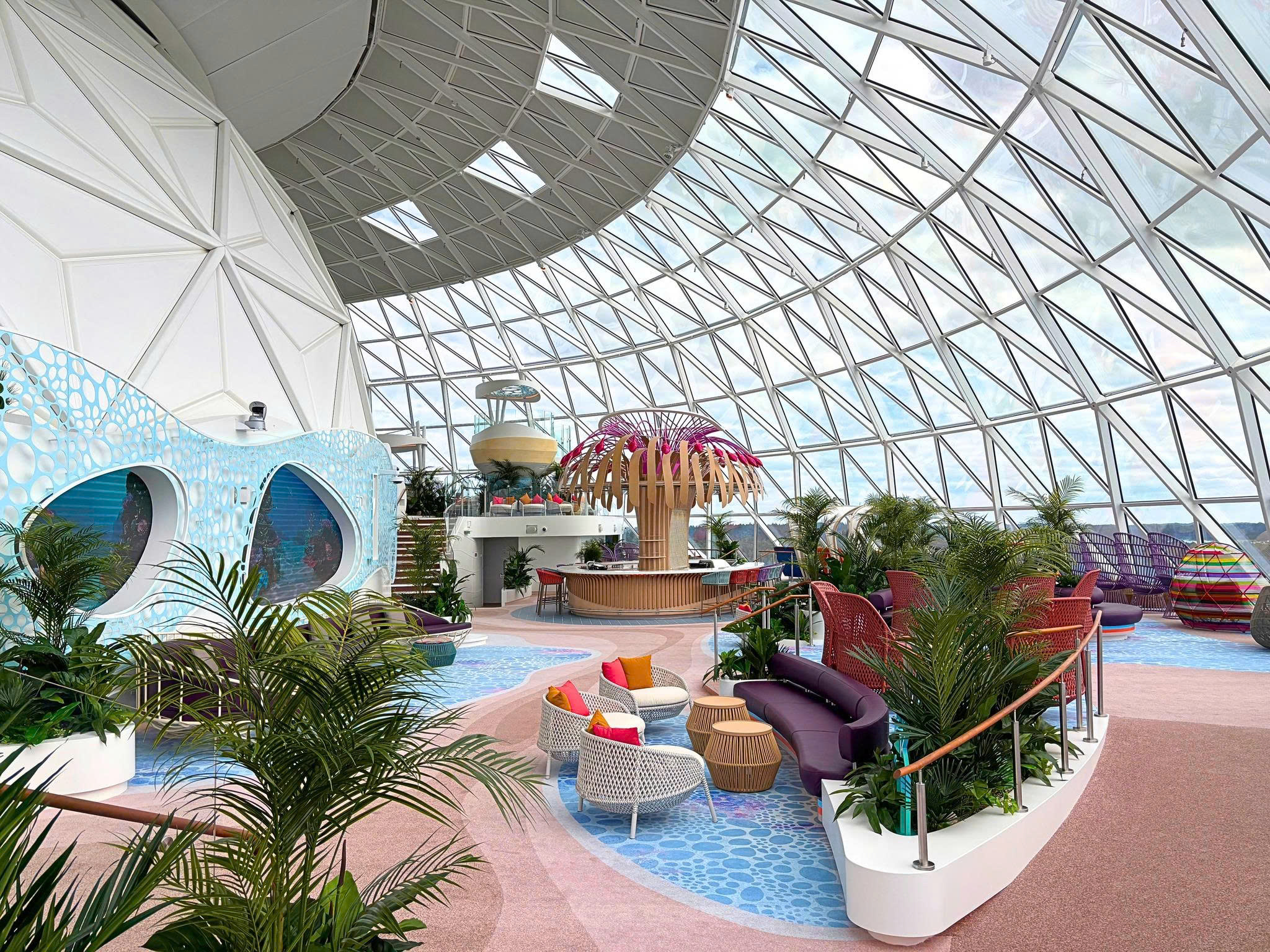 Khán phòng rộng rãi với ghế ngồi bậc thang, thiết kế hiện đại, mái vòm hình học, sân khấu trung tâm. Aquadome trên Star of the Seas (Ảnh: Adam Coulter)