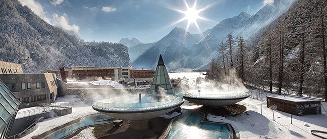 Aqua Dome của Längenfeld được ví như một spa sang trọng nằm trong bộ phim khoa học viễn tưởng, với các công trình hiện đại nằm trong dãy núi Ötztal Alps hùng vĩ. Nổi bật nhất ở đây là hai bể nước nóng hình đĩa bay, chứa đầy nước nóng đạt đến 97 ° F.