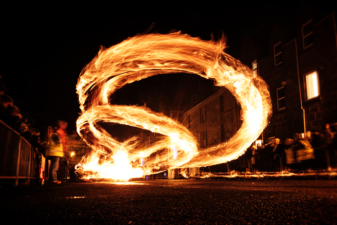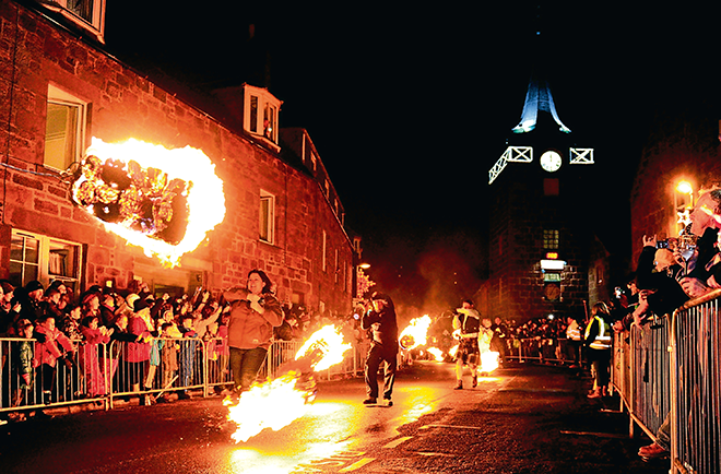 Lễ hội cầu lửa Hogmanay nổi tiếng nhất của Scotland là lễ hội ở Stonehaven, ngay trước khoảnh khắc giao thừa, những người nghệ sỹ chuyên nghiệp sẽ xuống đường diễu hành với những quả cầu lửa, họ quay các quả cầu này trên đầu rồi sau đó ném tất cả xuống biển.