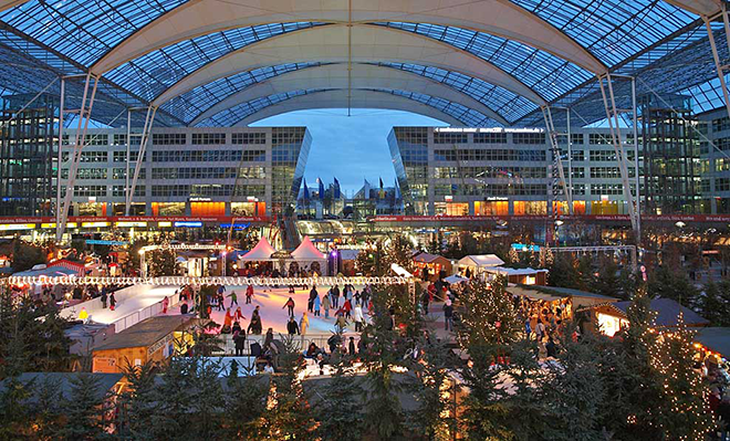 Nằm ở phía đông bắc của trung tâm thành phố Munich, MUC là một trong những sân bay nhộn nhịp nhất ở châu Âu và xếp thứ hai ở Đức, sau Frankfurt. Munich như là một trung tâm vận chuyển cho các hãng hàng không như Air Berlin, Lufthansa và Condor với kiến trúc thoáng mát, bề kính dày dặn. Gần đó có một công viên tham quan có sân golf mini và khu trưng bày lịch sử máy bay.