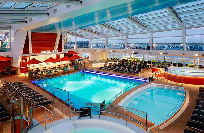 - Hồ bơi : có ba hồ chính, tất cả đều nằm trên tầng 14 bao gồm : 1 hồ bơi ngoài trời , 1 hồ bơi có mái che và một hồ bơi ở Solarium chỉ dành cho người lớn. Có rất nhiều ghế dài để nằm tắm nắng cũng như những chiếc ghế dài thoải mái trong bóng râm. Gần hồ bơi chính, có 1 máy phục vụ kem mát dịu và những đồ ngọt khác. Có 4 bể nước nóng luôn thu hút nhiều hành khách. Phía sau của khu vực bể bơi chính trên tầng 14 là khu H2O, dành cho các gia đình có trẻ nhỏ. Nó có một làn bơi cho trẻ nhỏ và hồ bơi cho trẻ sơ sinh. Ngoài ra còn có những chiếc ghế nệm cỡ nhỏ rất tâm lý dành cho các bé.