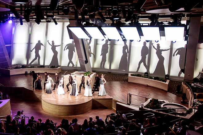 - Music Hall (tầng 3 và 4): được trang trí với màu đỏ tía và đen, Music Hall có hai tầng tổ chức nhiều buổi biểu diễn tưởng nhớ những nhóm nhạc huyền thoại bao gồm Led Zeppelin, Journey và Bon Jovi. Ở phía trước sân khấu là một sàn nhảy lớn thu hút nhiều hành khách yêu thích nhảy hàng đêm. Cầu thang dẫn đến tầng trên, nơi bạn có thể tìm 1 khu vực yên tĩnh hơn để nhâm nhi 1 ly cocktail và theo dõi ban nhạc và các vũ công. Trong ngày, Music Hall là nơi dành cho các lớp học khiêu vũ và các buổi hội thảo về hài kịch.