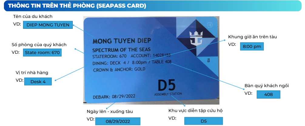 Lưu ý nhỏ: Trên thẻ có ghi rõ tên của du khách, số phòng (Stateroom), vị trí nhà hàng (Dining Deck), ngày lên - xuống tàu, giờ ăn và khu vực tập trung cứu hộ (Assembly Station). Hãy giữ thẻ cẩn thận nhé!