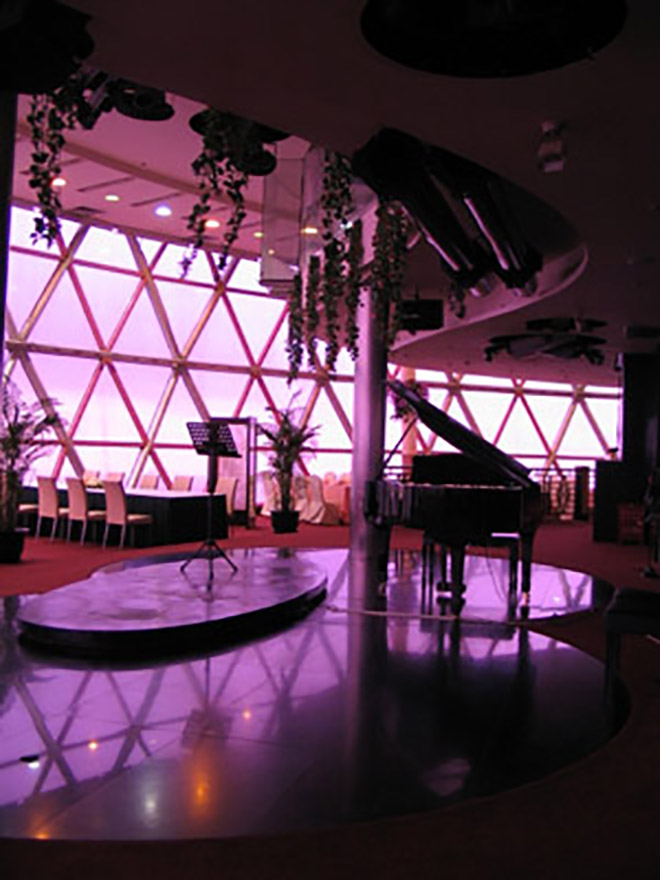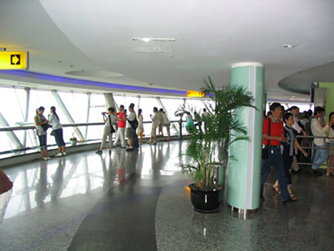 Tháp có 3 tầng quan sát. Tầng cao nhất (được gọi là mudule không gian) cao 350 m. Các tầng thấp hơn là 263 m (tầng ngắm cảnh) và 90 m (thành phố không gian). Có một nhà hàng xoay ở tầng cao 267 m. Tháp cũng có các căn phòng triển lãm, nhà hàng và mua sắm. Có 20 phòng khách sạn gọi là Khách sạn không gian giữa hai quả cầu lớn.