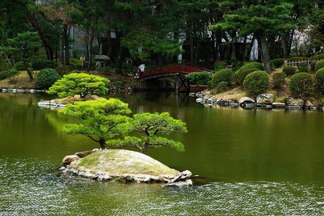 Bạn sẽ bị ấn tượng bởi khu vườn Shukkeien tại thành phố Hiroshima bởi khu vườn này chỉ toàn cây và cây, khác hẳn với thế giới bên ngoài. Du khách sẽ đi trên con đường nhỏ quanh co, băng qua cây cầu bắc qua bờ ao và sẽ bắt gặp thác nước nhân tạo rất đẹp và điều đặc biệt cuối cùng là dừng chân để thưởng thức chén trà thơm dịu ở quán trà đạo trong khu vườn. Vào mùa xuân, tất cả hoa anh đào trong vườn sẽ nở rộ một màu hồng thắm như đón chào năm mới đã sang. Mùa thu lại khoác lên màu vàng dịu dàng, còn mùa đông tất cả đều trở nên lấp lánh bởi những ánh đèn neon.
