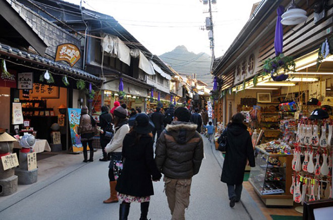 Điểm đến tiếp theo của Hiroshima là Phố mua sắm Omotesando nằm trên đoạn đường từ cảng Miyajima đến đền Itsukushim. Đến khu phố tấp nập này du học sinh sẽ bị kích thích bởi hương thơm những món ăn trứ danh của vùng đất Hiroshima như cơm cá chình biển (Anago Meshi) hay món hàu nướng,…. Chưa hết, cửa hàng lưu niệm san sát nhau sẽ khiến bạn hoa mắt đó.