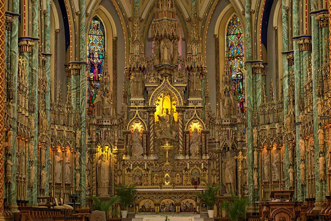 Nhìn từ xa nhà thờ trông như những dải lụa đa sắc, hai hàng cột chạy dài ngay tại giữa thánh đường với vòm trần trên cao hay cấu trúc thăng bằng được thể hiện ngay phía mặt tiền cửa chính mang lối kiến trúc Pháp thế kỷ XIII.