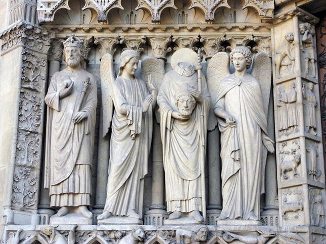 Bức tượng người mất đầu ở nhà thờ Đức Bà Paris có nguồn gốc từ câu chuyện thánh Denis bị quân La Mã bắt giảng đạo rồi chém đầu năm 250 trên đỉnh đồi Montmartre. Truyền thuyết kể rằng cơ thể không đầu của thánh Denis đã đứng dậy nhặt đầu mình và vừa đi bộ vừa giảng đạo. Du khách tiến về phía cánh cửa trái ở cổng mặt Tây của nhà thờ sẽ thấy bức tượng kỳ lạ này.