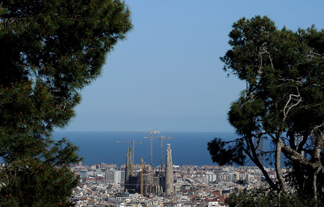 Vương cung Thánh Đường Sagrada Familia nổi bật lên giữa lòng thành phố Barcelona, bao quanh bởi khu dân cư đông đúc.
