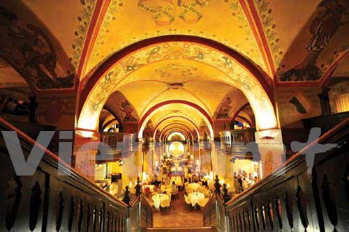 Buổi tối, chúng tôi được mời đến một nhà hàng tầng hầm rượu vang tuyệt đẹp có tên Kornhauskeller, cách khách sạn và khu trung tâm chỉ vài bước chân. Ngay từ lối vào, nhìn từ trên cao xuống, nhà hàng này giống như tầng hầm của một nhà thờ.