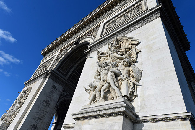 Bốn tác phẩm điêu khắc lớn nhất là: Xuất quân 1792 và Khải hoàn 1810 phía Champs-Elysées, Kháng chiến 1814 và Hòa bình 1815 phía Grande-Armée. Trong đó Xuất quân, tên đầy đủ Xuất quân của các chiến sĩ tình nguyện 1792 (Le départ des volontaires de 1792), tức La Marseillaise nổi tiếng hơn cả. Tác phẩm của nhà điêu khắc François Rude, cao 11,6 mét rộng 6 mét. Mặt phía trong bốn chân của Khải Hoàn Môn được trang trí bởi các bức phù điêu miêu tả những trận đánh nổi tiếng thời Cách mạng và Đế chế. Bên dưới khắc tên tuổi các nhân vật nổi tiếng trong giai đoạn lịch sử đó. Sáu bức phù điêu, bốn phía trên các tượng đài và hai ở các cạnh bên, mô tả những giai đoạn, sự kiện của Cách mạng Pháp và Đế chế. Ngoài ra bề mặt Khải Hoàn Môn còn có các phù điêu nhỏ khác.
