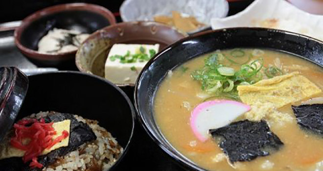 Một trong những món ăn địa phương ở Kumamoto là “Súp bột hấp” ăn kèm với “cơm mù tạt”. Bột hấp có 2 loại làm từ bột mì và bột gạo nếp rất mềm và mịn. Nước súp có vị ngọt của khoai sọ được chế biến và thay đổi qua hơn 40 năm.