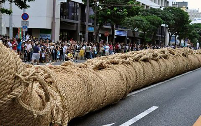Có lịch sử 600 năm, lễ hội kéo co của Okinawa từng được ghi vào sách kỷ lục Guinness. Chỉ cần nhìn chiếc thừng dùng để kéo co thôi là các bạn có thể hiểu rằng không đơn giản chỉ là kéo làm sao cho thắng mà chỉ là nâng được thừng lên thôi cũng đủ … vã mồ hôi rồi.